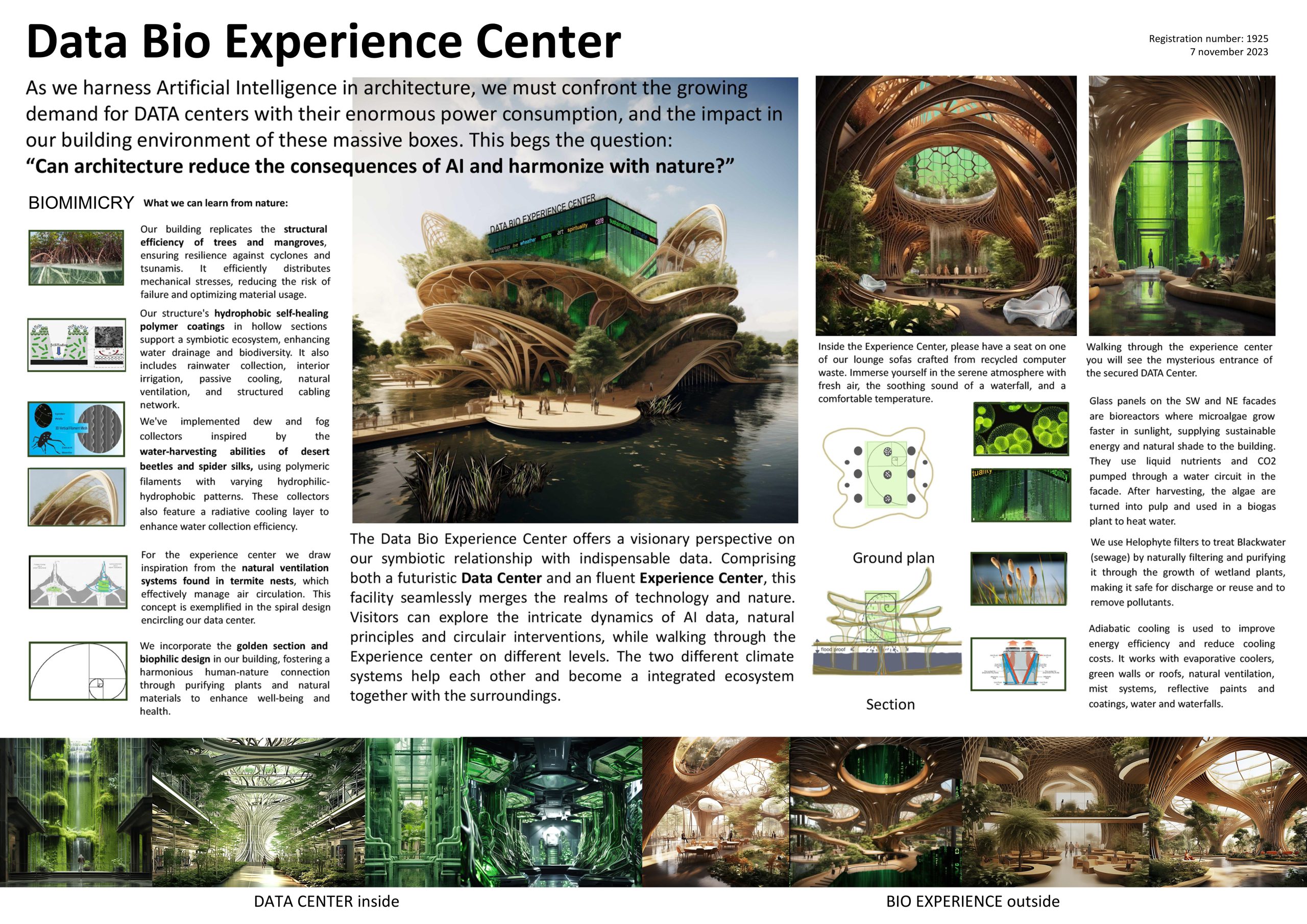 The ‘oldfashioned’ data centers need a lot of cooling and a lot of space in our surroundings what makes a big impact on our environment: the way our environment looks and the m2 the datacenters use. This leads to an important question: ‘Can we make AI and nature work together through architecture? While architecture alone can’t solve all the issues associated with data centers, the ‘DATA Bio Experience Center’ aims to minimize problems and harness nature’s strengths with Biomimicry principles.