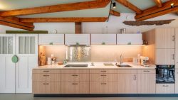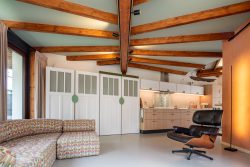 De natuur is niet alleen buiten aanwezig, maar ook voelbaar in het huis zelf. Er is gewerkt met natuurlijke en circulaire materialen zoals riet, inblaasstro, leemstuc, kurkpanelen, eikenstammen uit het omliggende bos, inblaascellulose, houtvezelisolatie, sedum, beukenhout en oude deuren die een nieuw leven kregen. Vanuit elke ruimte is er direct zicht op het groen rondom, waardoor binnen en buiten naadloos in elkaar overlopen.