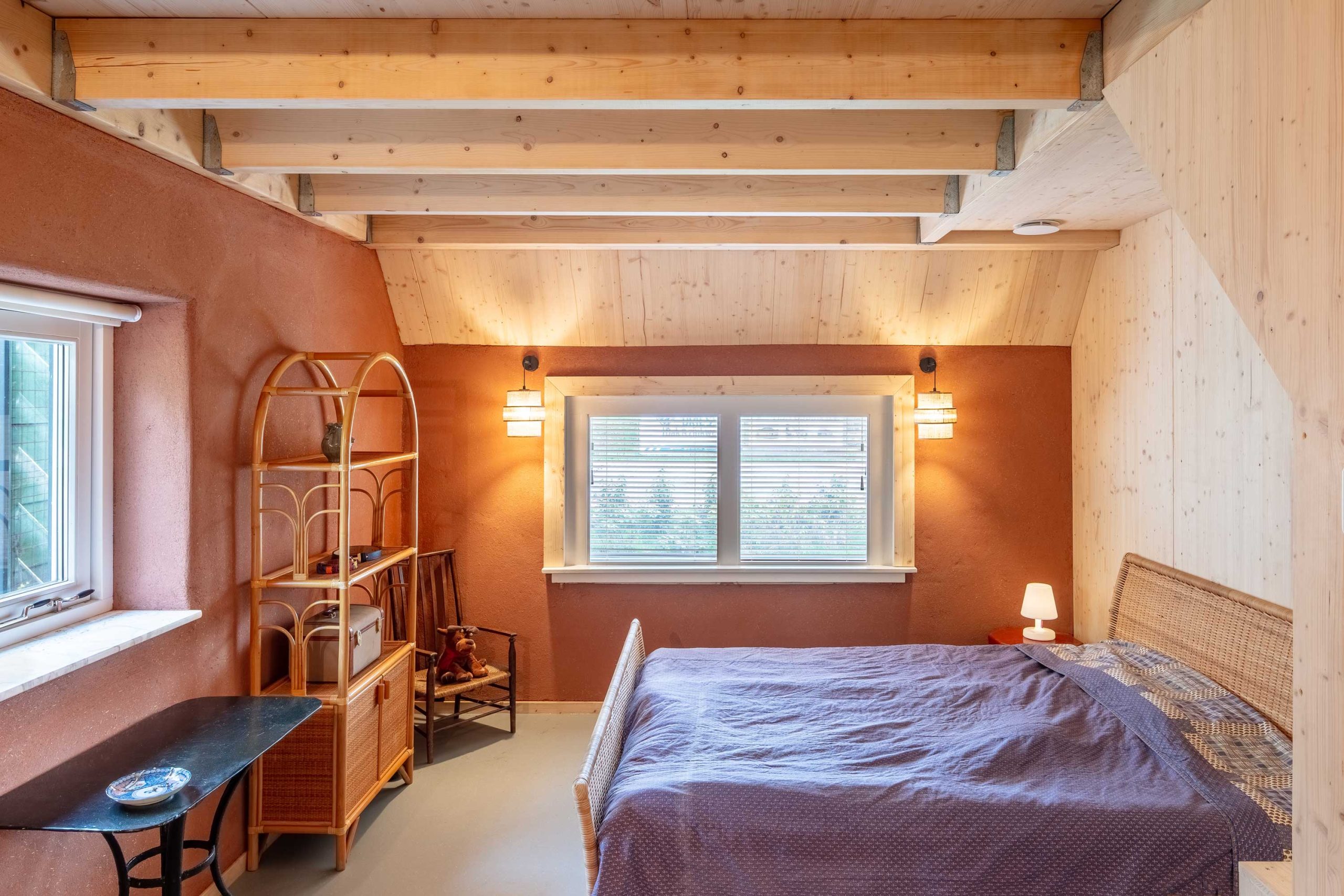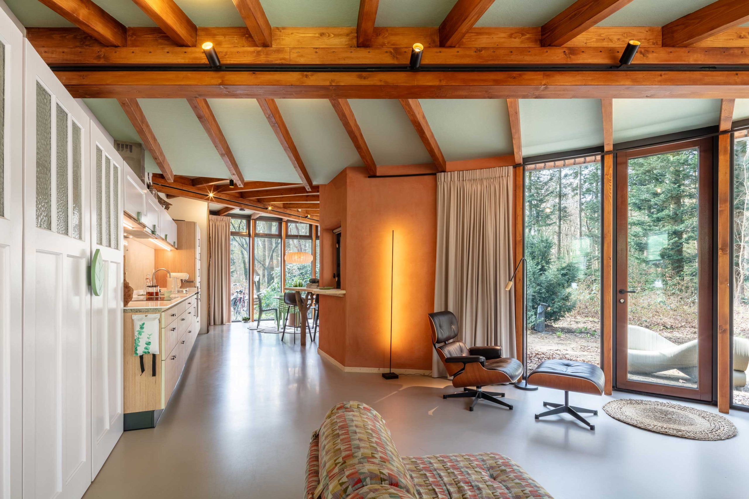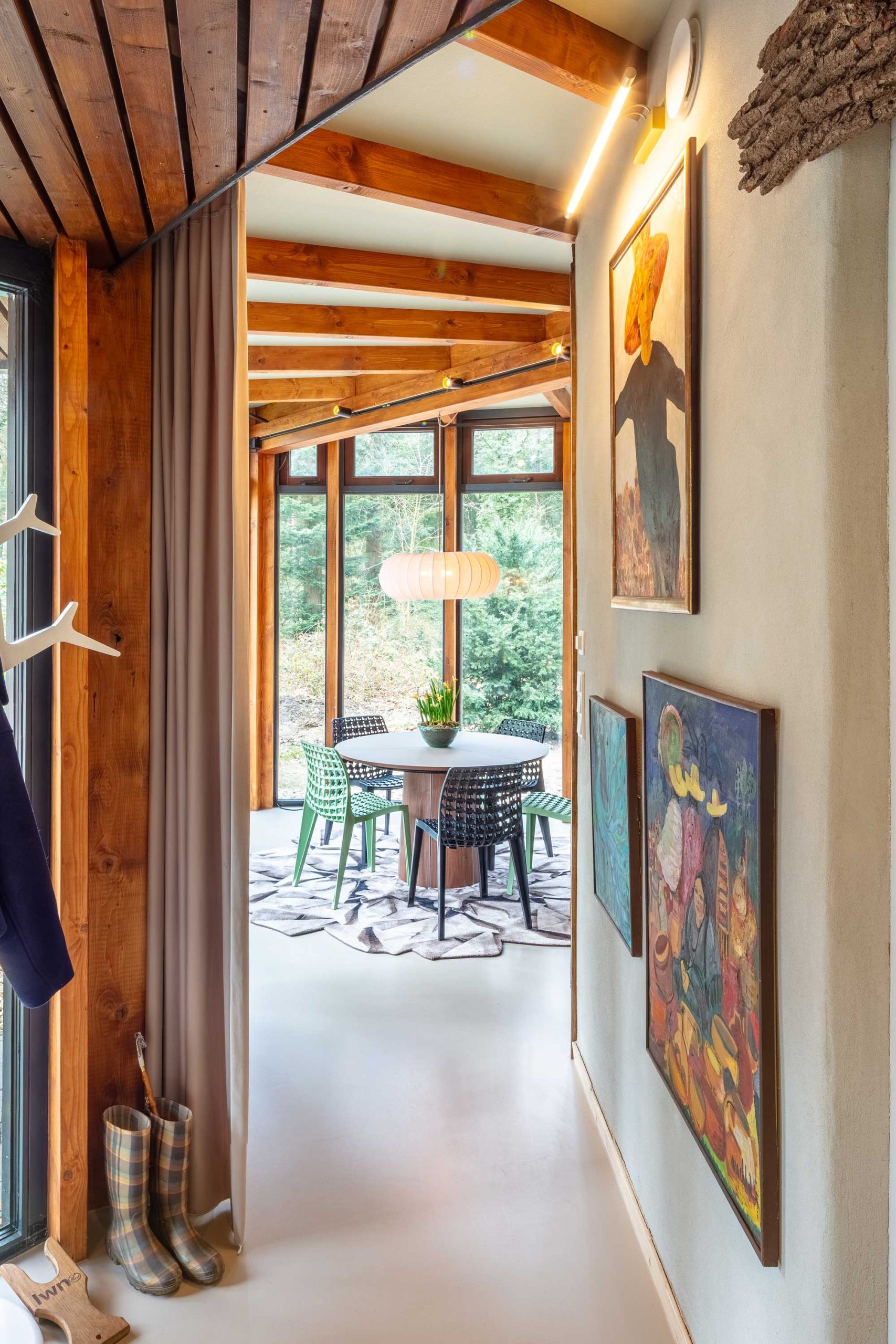 De natuur is niet alleen buiten aanwezig, maar ook voelbaar in het huis zelf. Er is gewerkt met natuurlijke en circulaire materialen zoals riet, inblaasstro, leemstuc, kurkpanelen, eikenstammen uit het omliggende bos, inblaascellulose, houtvezelisolatie, sedum, beukenhout en oude deuren die een nieuw leven kregen. Vanuit elke ruimte is er direct zicht op het groen rondom, waardoor binnen en buiten naadloos in elkaar overlopen.