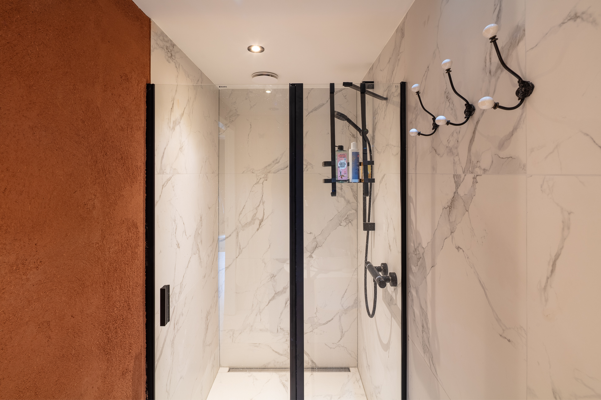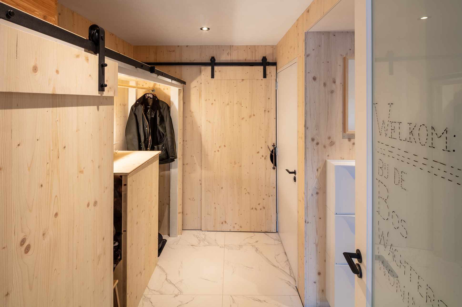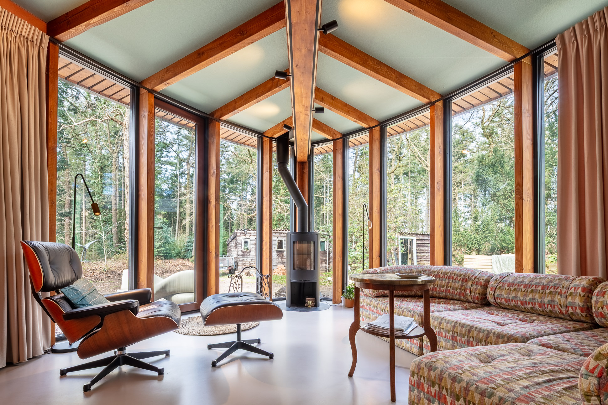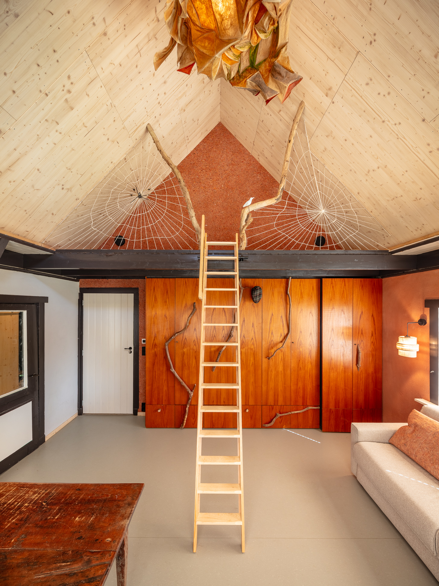 De natuur is niet alleen buiten aanwezig, maar ook voelbaar in het huis zelf. Er is gewerkt met natuurlijke en circulaire materialen zoals riet, inblaasstro, leemstuc, kurkpanelen, eikenstammen uit het omliggende bos, inblaascellulose, houtvezelisolatie, sedum, beukenhout en oude deuren die een nieuw leven kregen. Vanuit elke ruimte is er direct zicht op het groen rondom, waardoor binnen en buiten naadloos in elkaar overlopen.